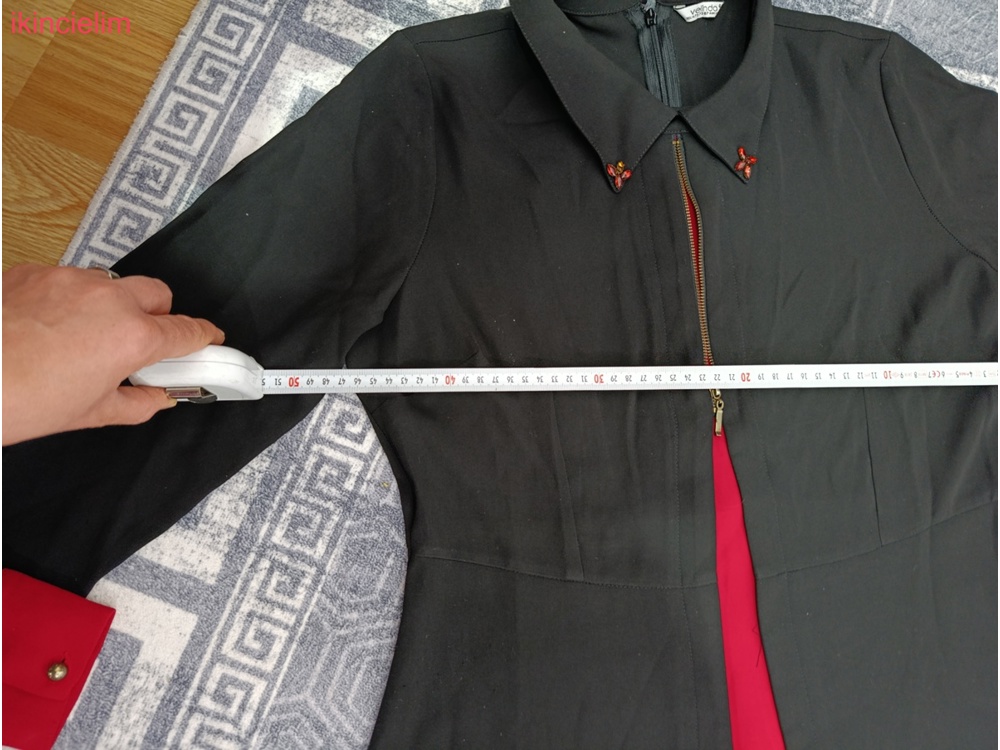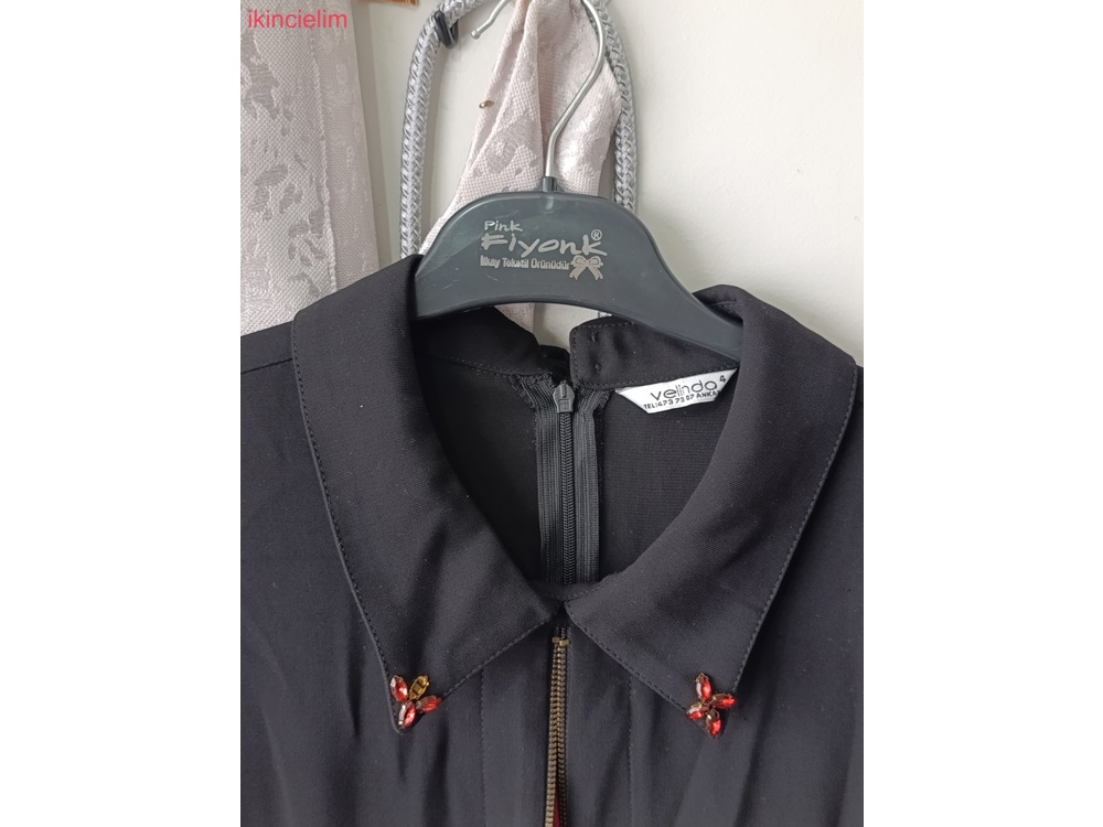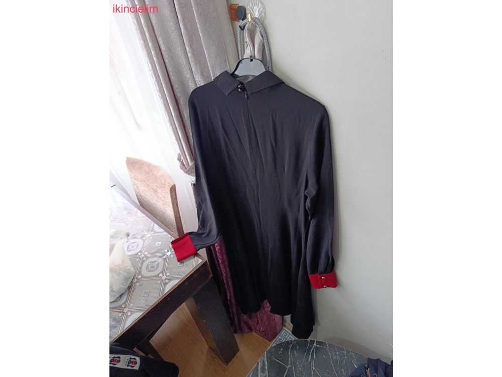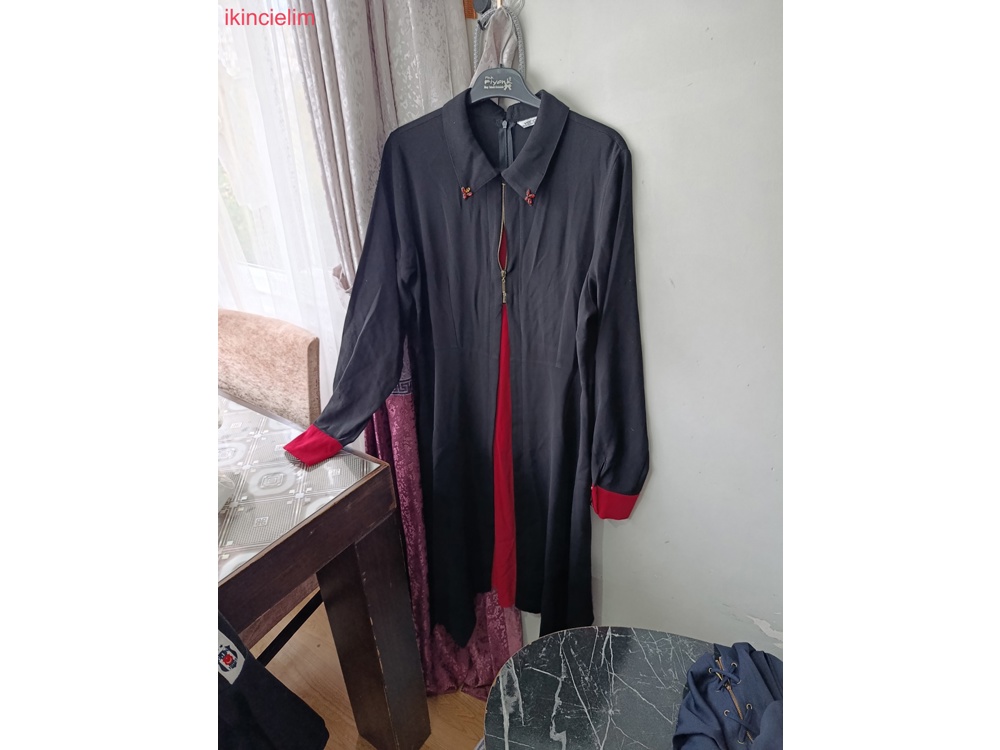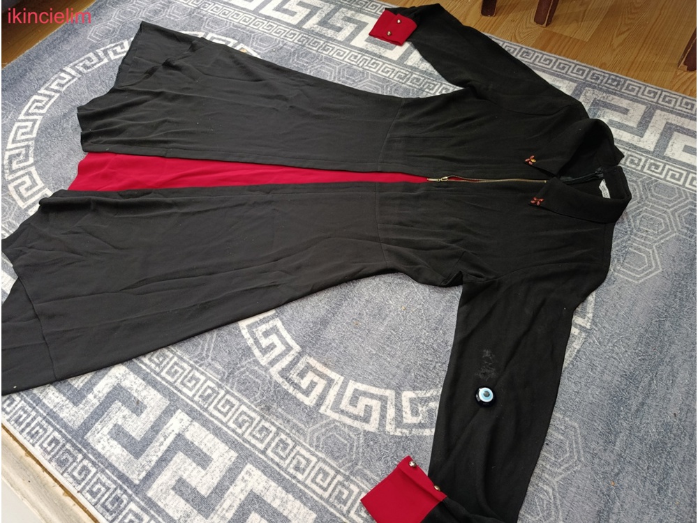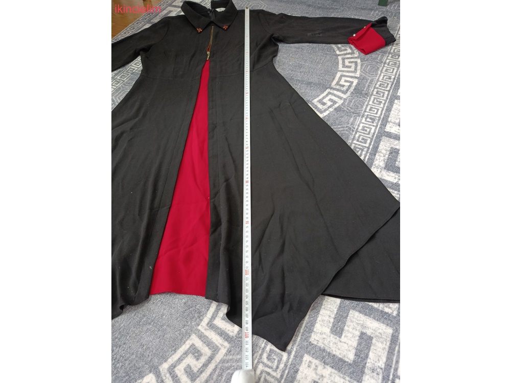 Nakış işlemeli ve püsküllü siyah uzun kaban Geniş yakalı, satenimsi kumaştan, kırmızı astarlı ve uzun kollu. bi kere kullandım ihtiyaç fazlası olduğu için satışta sıfır canlı siyahtır
