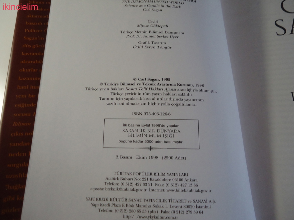 Carl Sagan - Karanlık Bir Dünyada Bilimin Mum Işığı. Tübitak ve Yapı Kredi Yayınları. Ciltli. 1998 (3.) Baskı. 372 sayfa. Çeviri: Miyase Göktepeli. Sıfır kadar temiz..