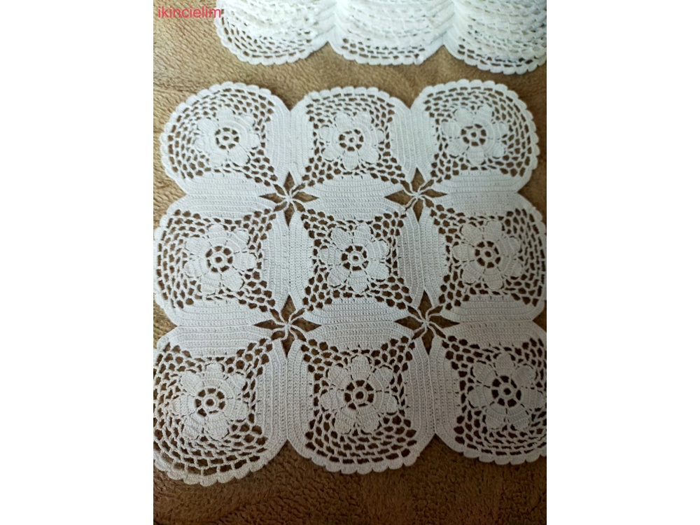 ürün yenidir kendim ördüm 10 âdet kare parça vardır 4 âdet köşeli kumaşa geçirilmiş üçgen parça vardır isterseniz ürünü yeni modası kumaşa geçittirebilirsiniz salon takımı veya başka bir şey yaptırabilirsiniz ürün hiç kullanılmadı fazlaliktan dolayi satılıktır