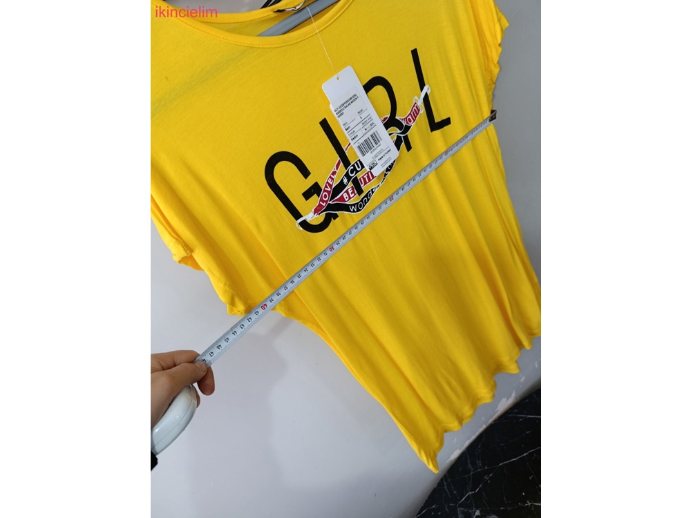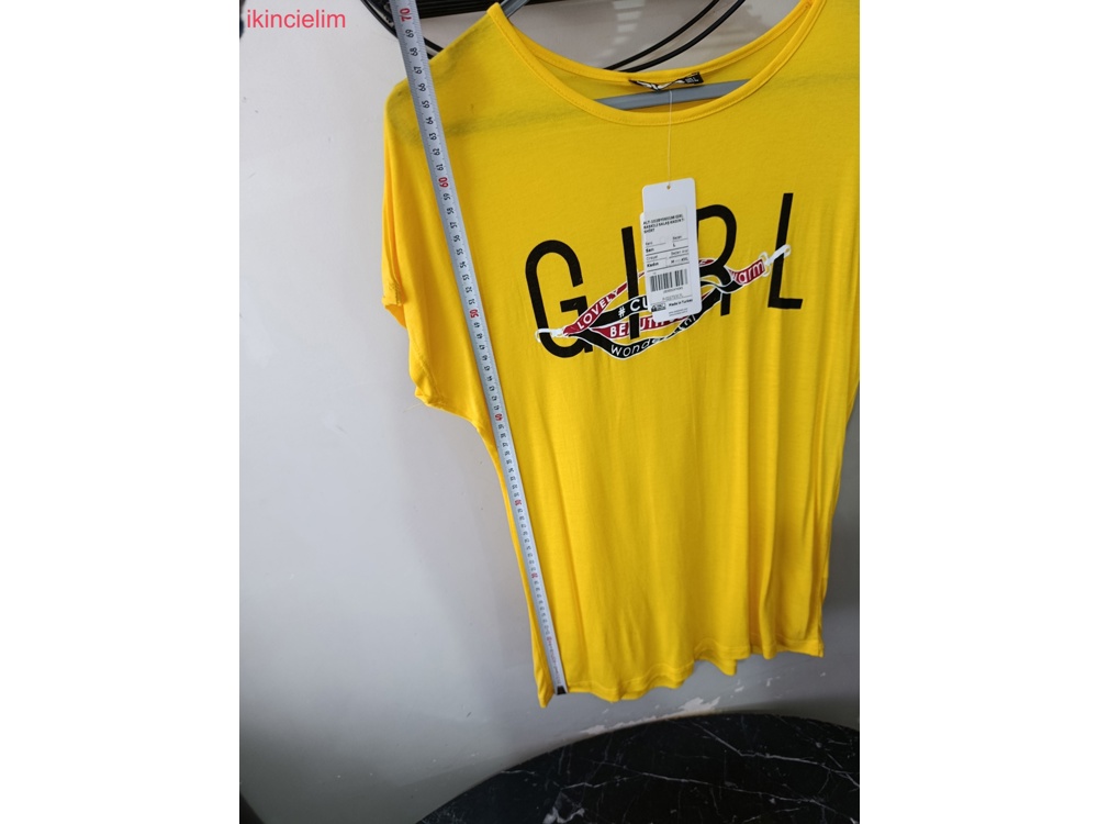 Sarı kısa kollu kadın tişörtü, bisiklet yaka ve renkli baskılı tasarıma sahiptir. Esnek sentetik kumaştan, rahat kesimlidir.